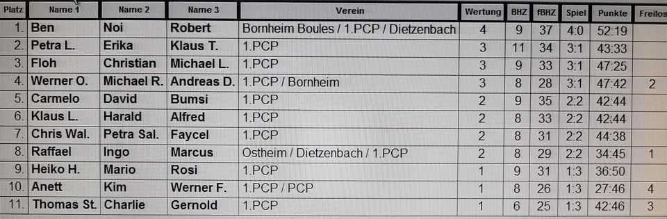 Trotz mehrerer krankheitsbedingter Absagen war es kein Problem jeweils wieder ein Nachrückerteam z um Start der 3. Wintergames zu finden. So waren pünktlich um 16.00 Uhr wieder 12 Mannschaften in der gut geheizten Boulescheune am Start. Zwischen spannenden Partien konnte man sich an hervorragendem Chili und an der gut gefüllten Salat- bzw. Kuchentheke laben. Den Außentemperaturen geschuldet, bestand auch die Möglichkeit, sich mit Glühwein zu wärmen.